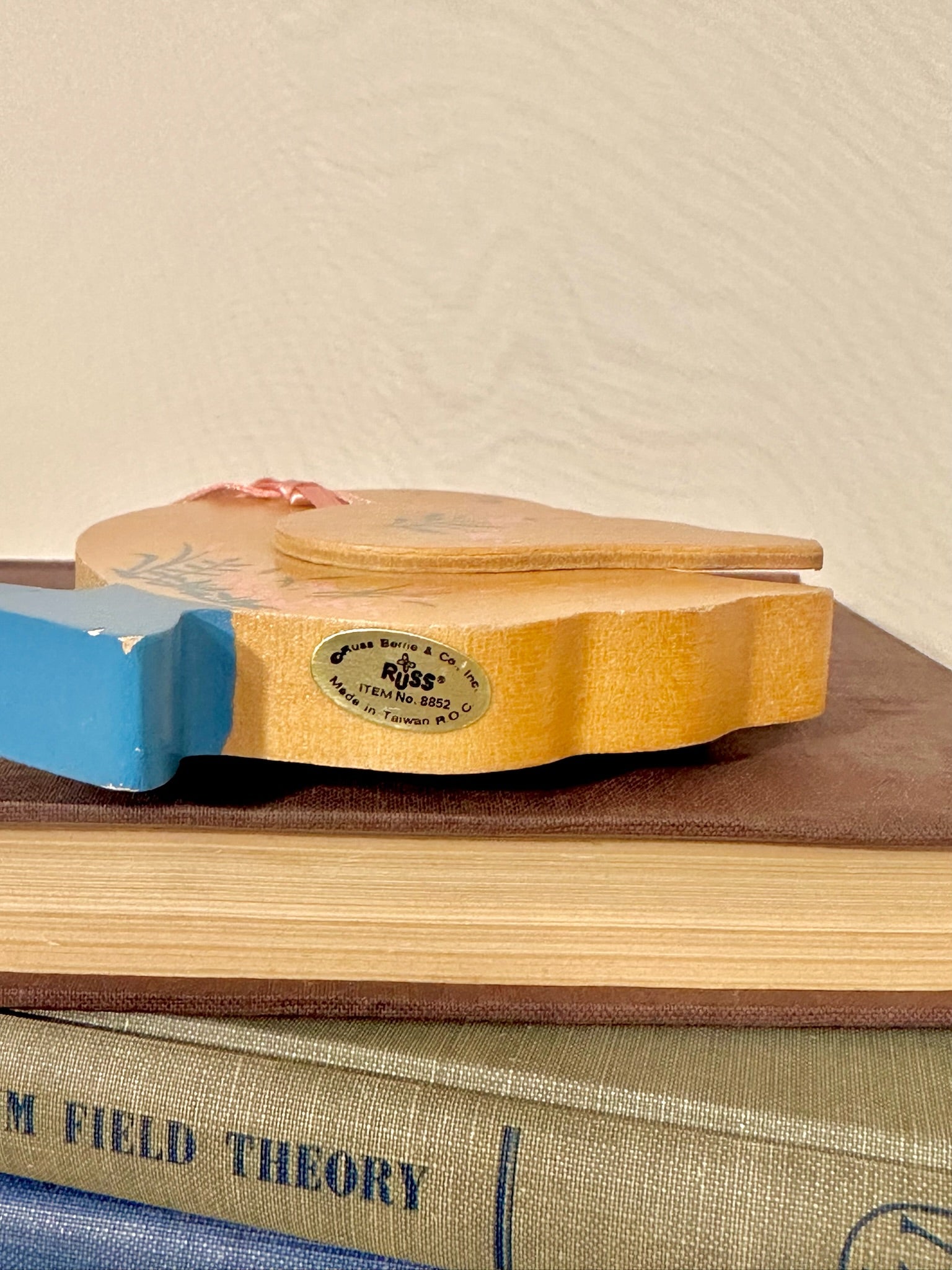 This vintage wooden duck is a collectible item made by Russ Berrie & Co in the 1980's. This piece is painted on both sides with a bow on the neck.