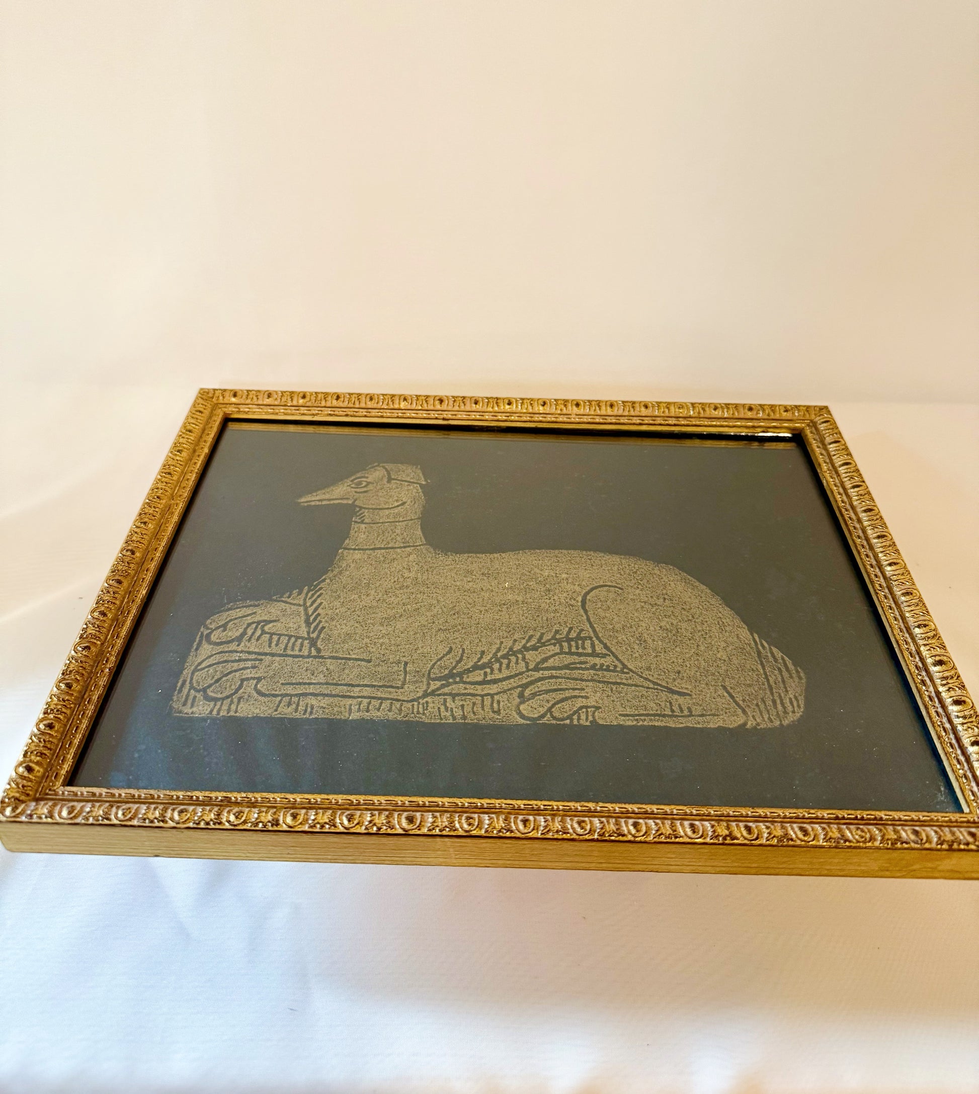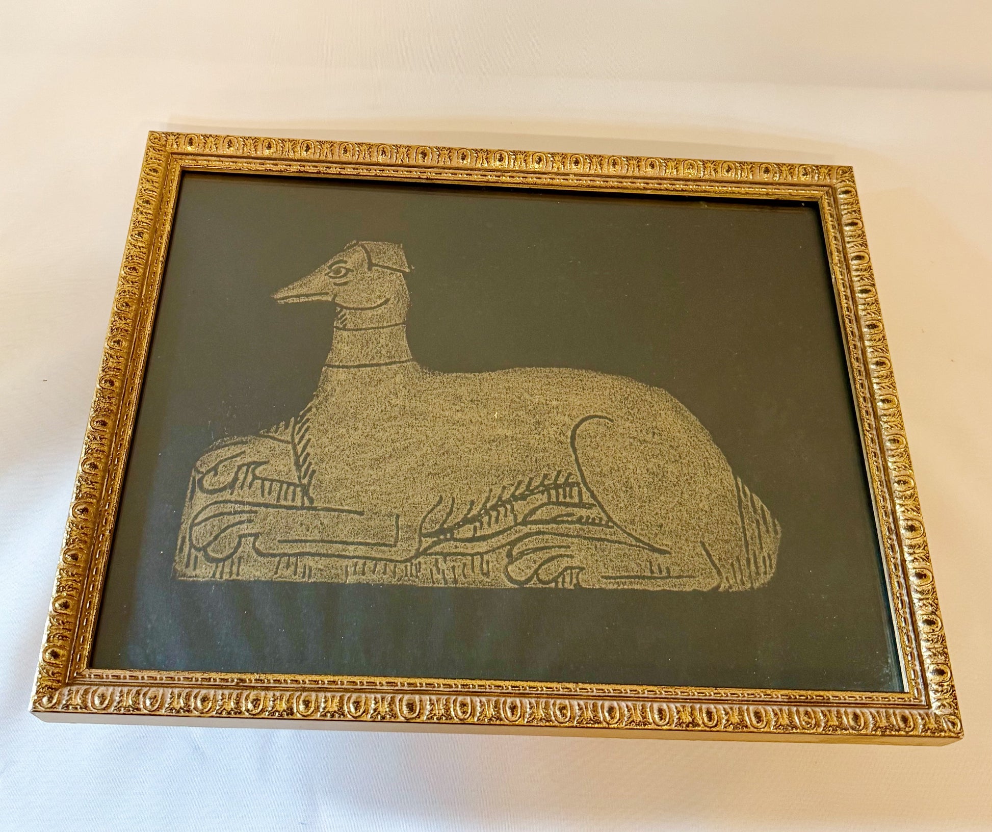 This artwork was created using a brass rubbing technique. Its beautiful stylized technique has been framed and preserved in an intricate frame.