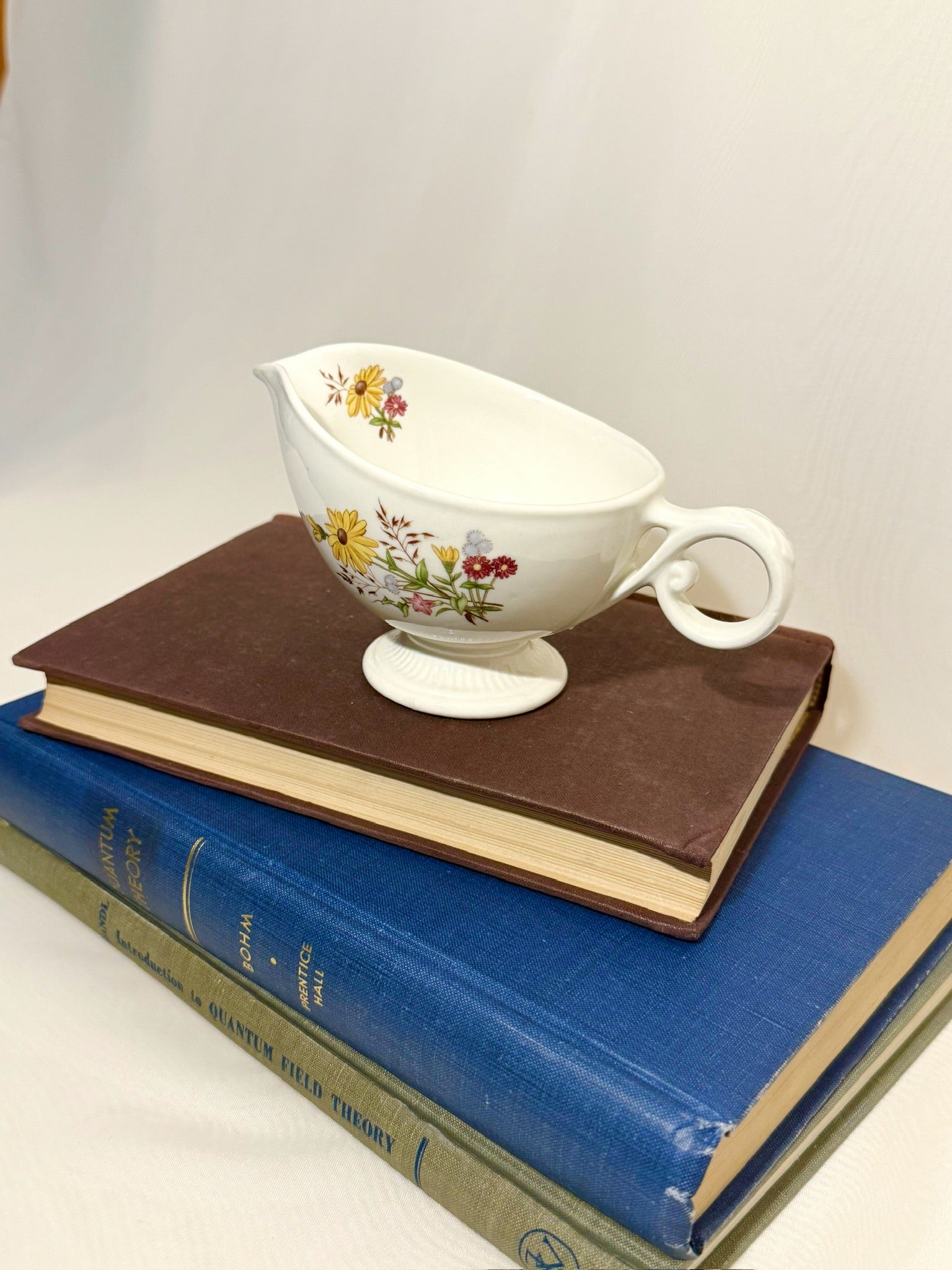 This cream boat features a double-sided design for versatile display options, while delicate accents adorn the interior.