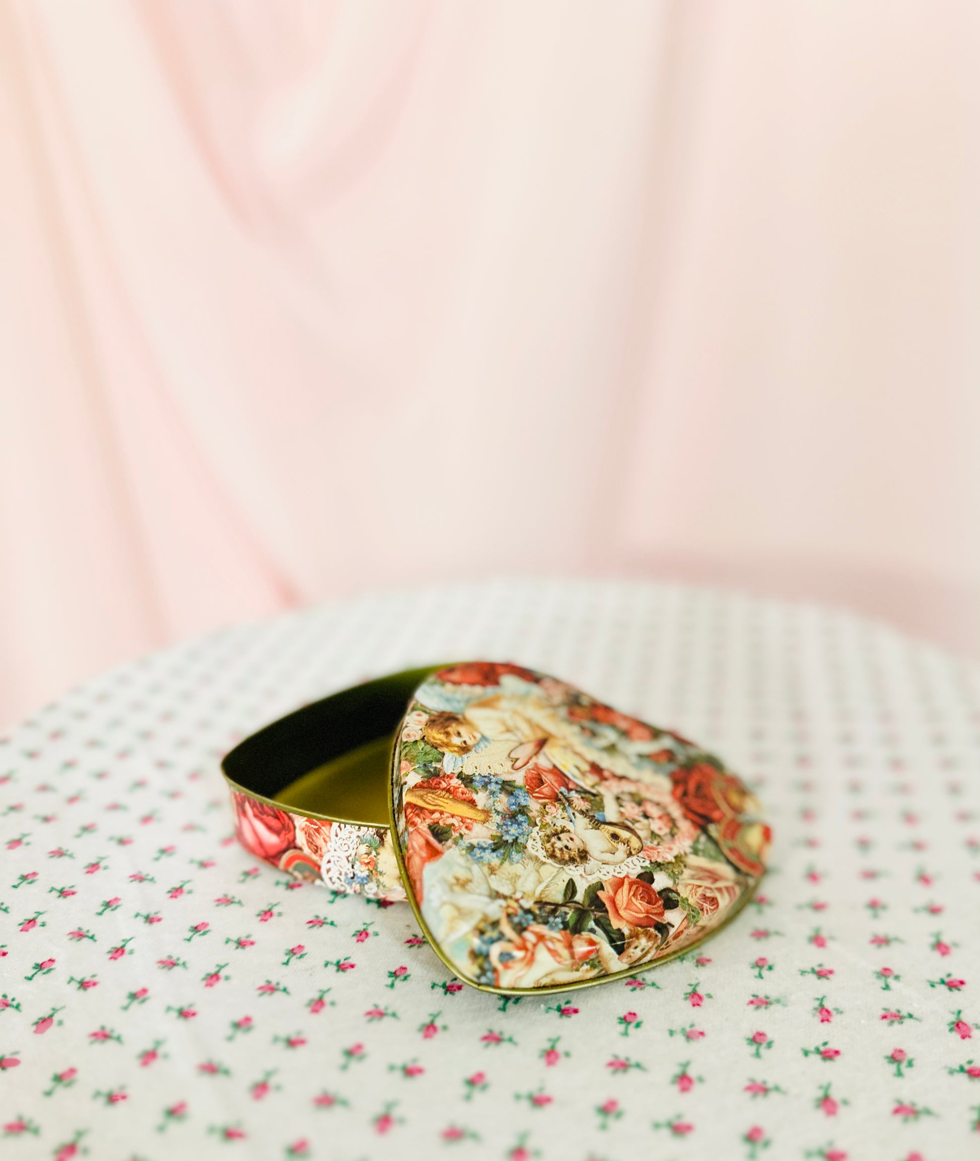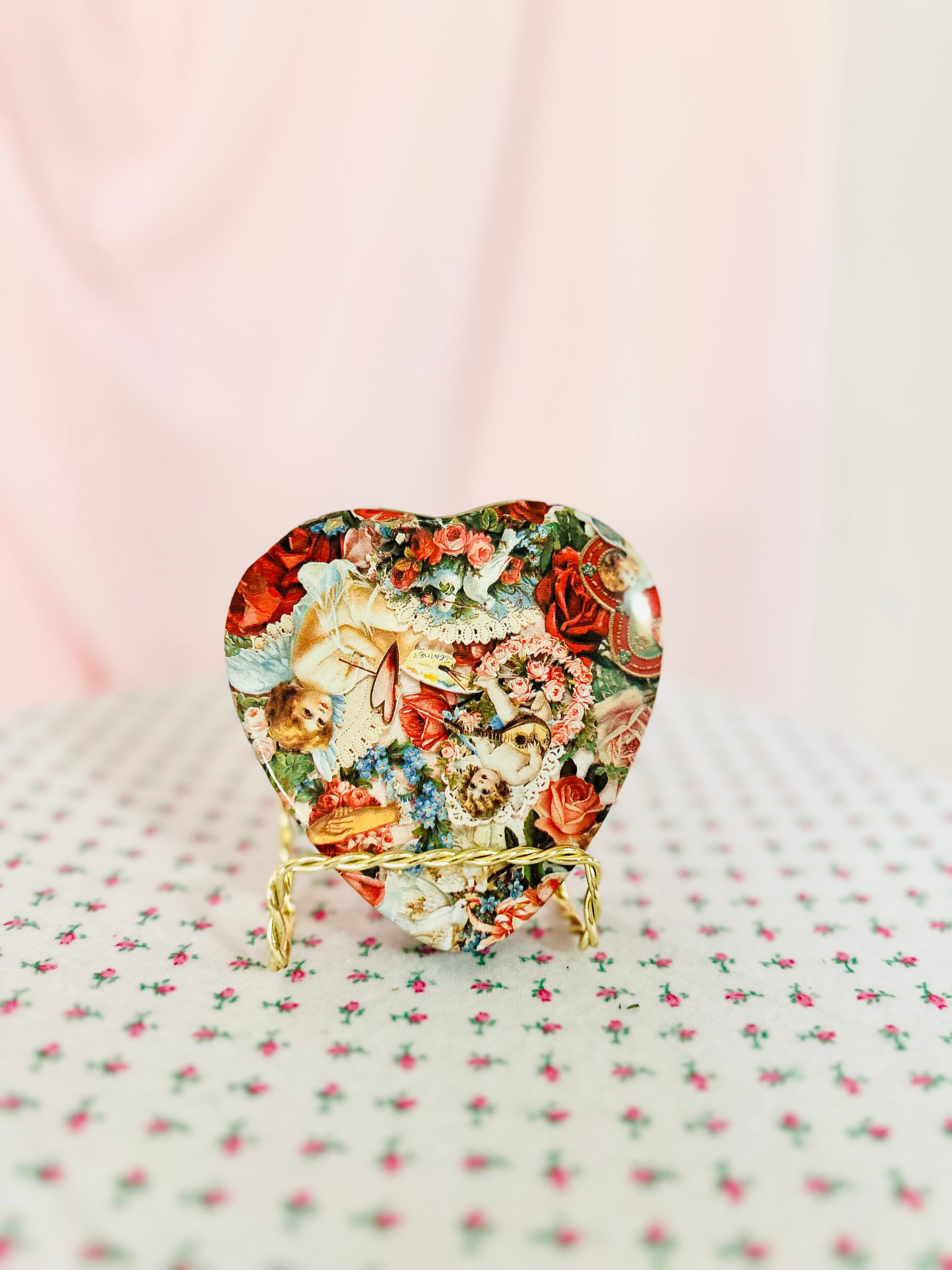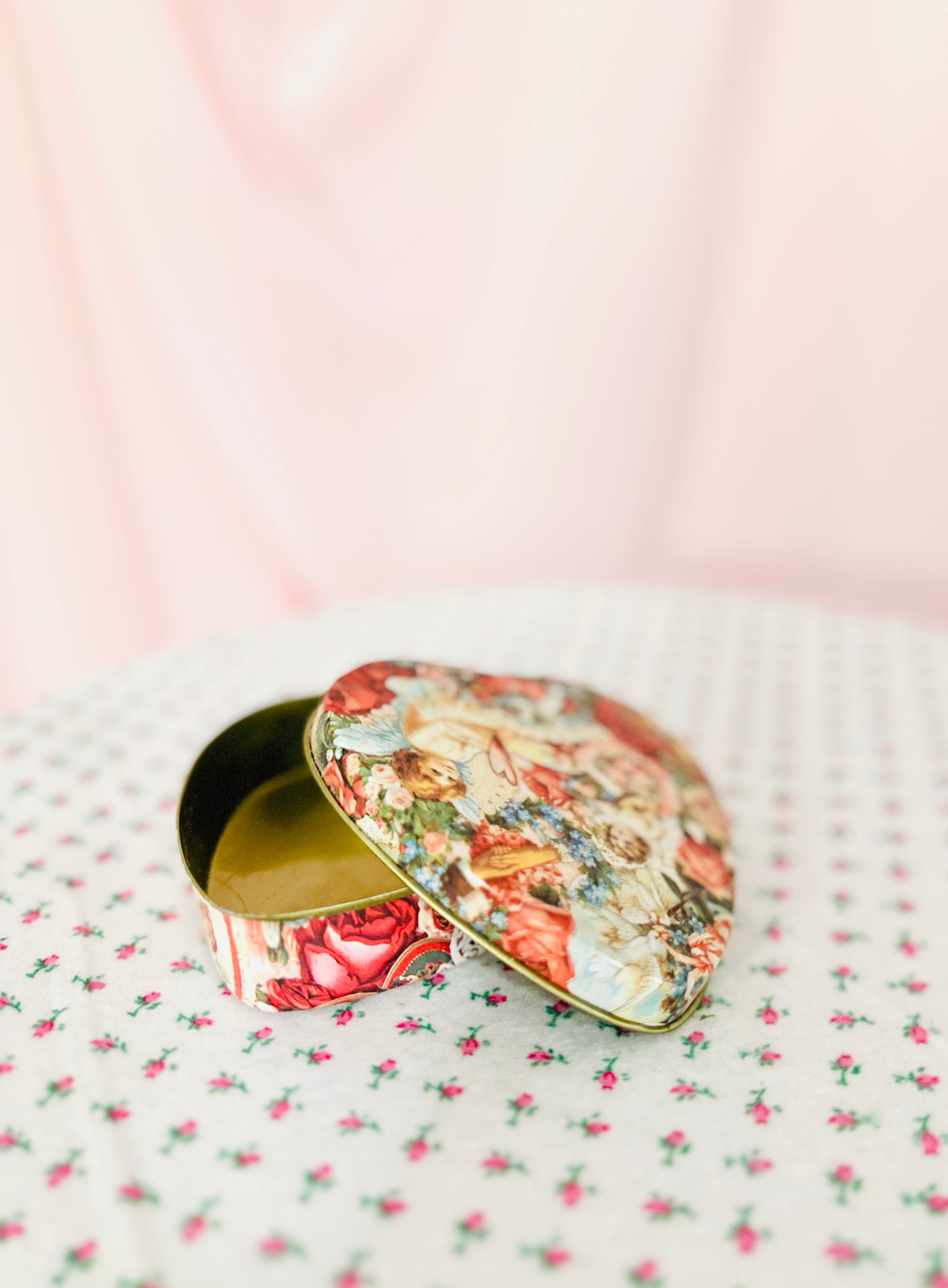 A heart-shaped tin with cherubs and floral details in a classic ’90s aesthetic. Sweet, nostalgic, and perfect for holding little keepsakes or treasures.