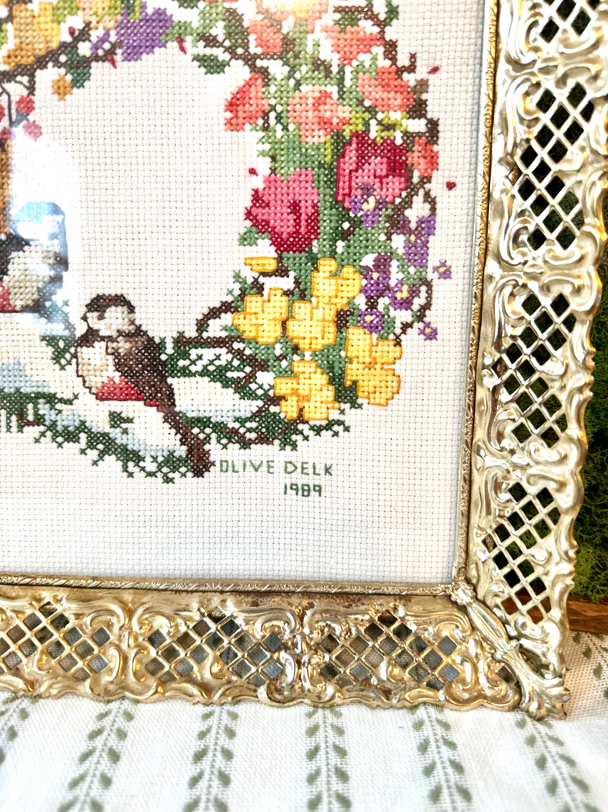 A elegant cross stitch by Olive Delk, featuring delicate birds and florals. Set in a gold and ornate frame, this piece combines handcrafted charm with elegant detailing, perfect for adding a touch of artisanal sophistication to any wall or vignette.