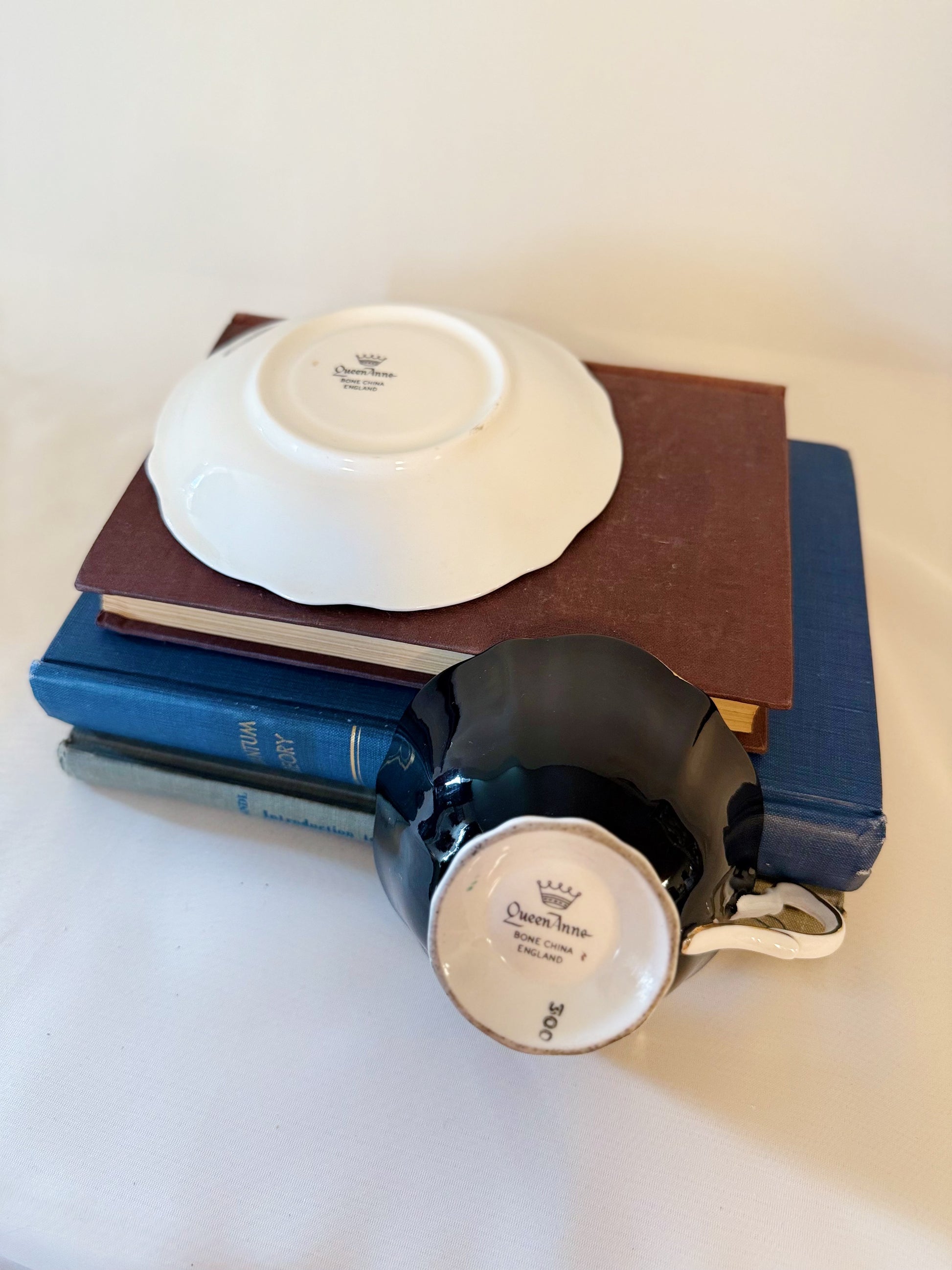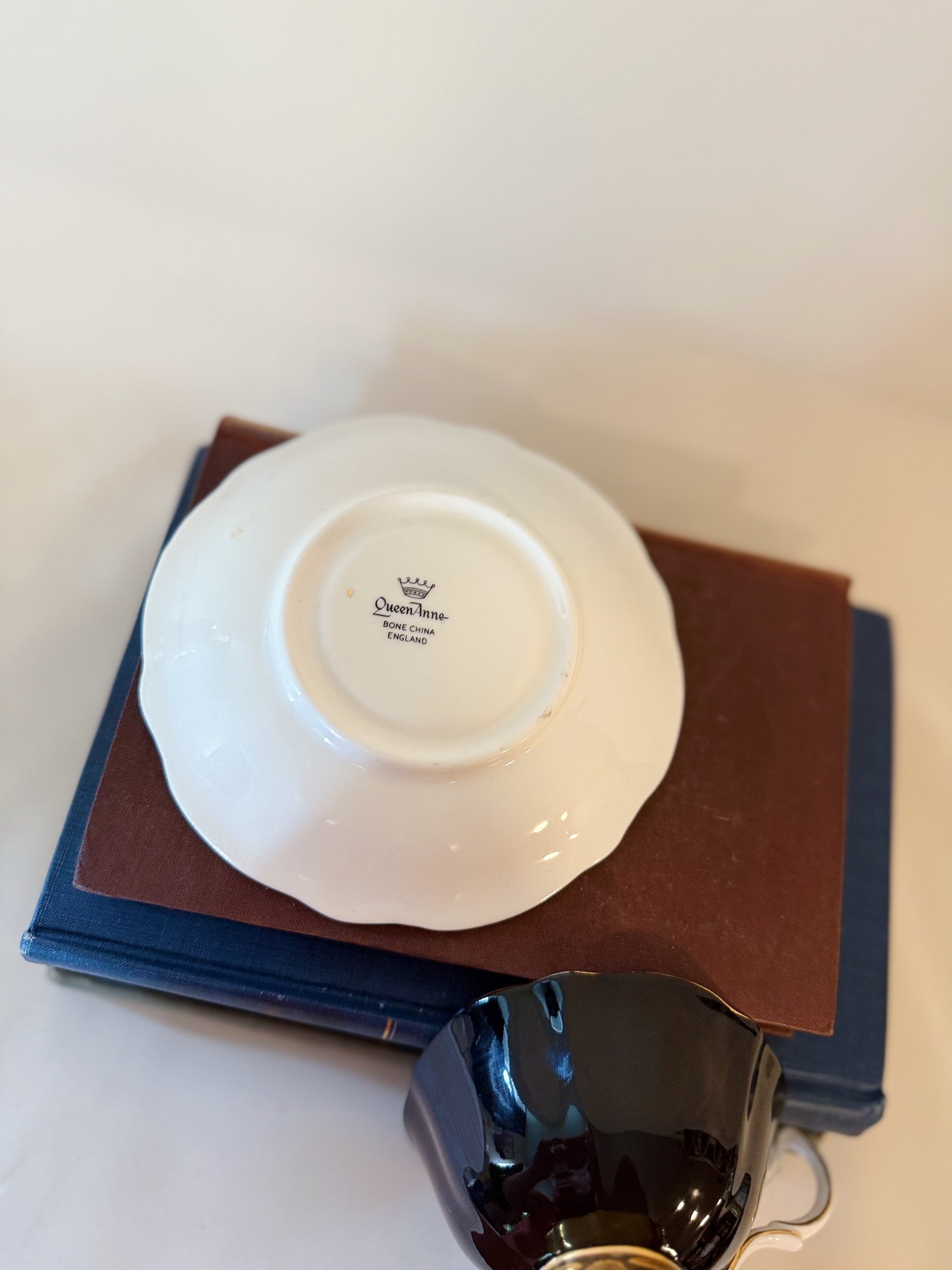 Queen Anne Black Teacup and Saucer with Heavy Gold Rose Bone China Pattern 300