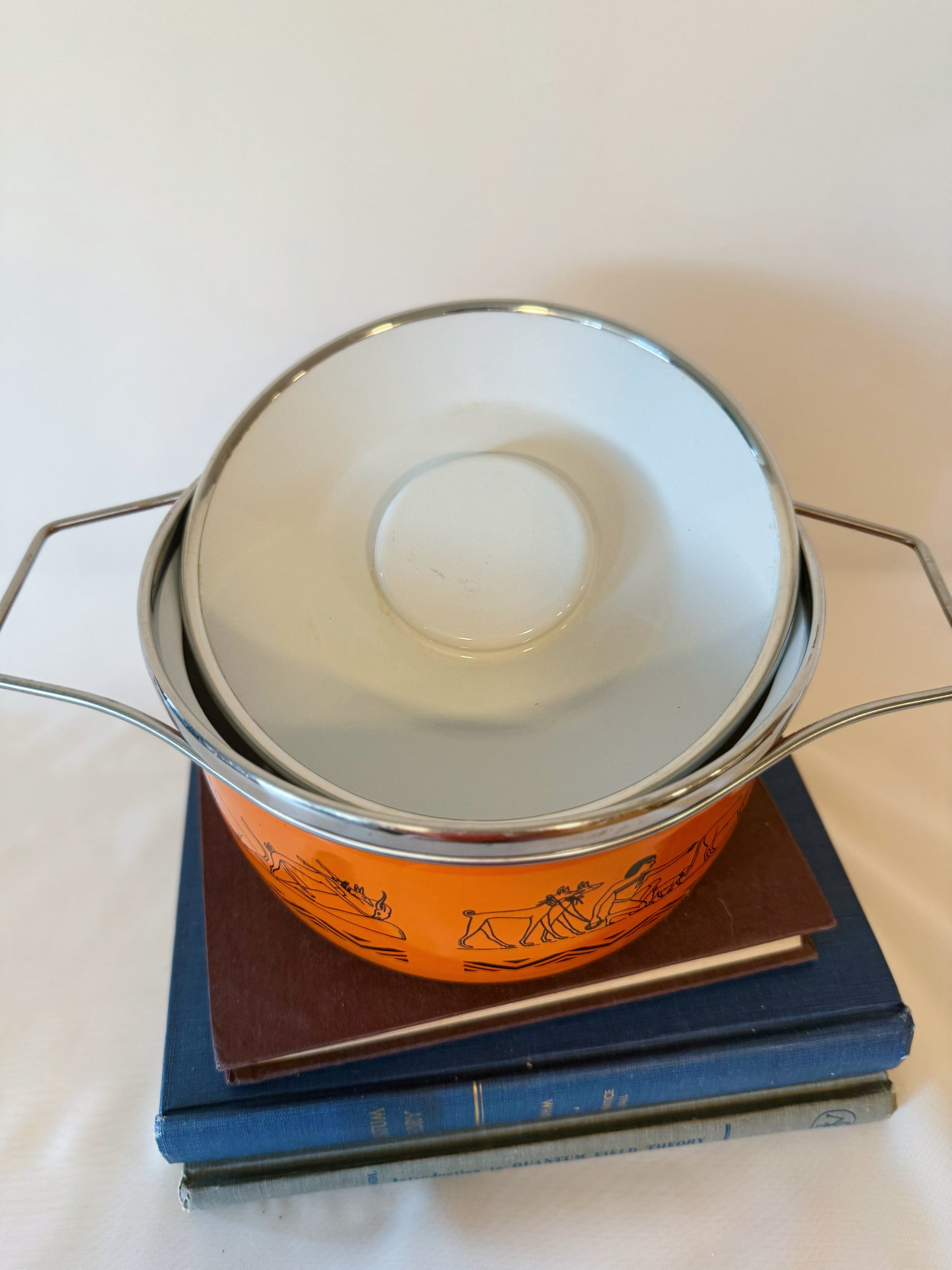 Crafted by an Italian company in the 70s, this Siltal Saucepan features a unique design blending Roman scenes with Egyptian imagery and classic Roman themes. This vintage piece combines artistic heritage with practical use, making it a charming addition to your kitchen collection. Its enamel finish ensures durability and easy cleaning, perfect for everyday cooking with a touch of historical elegance.