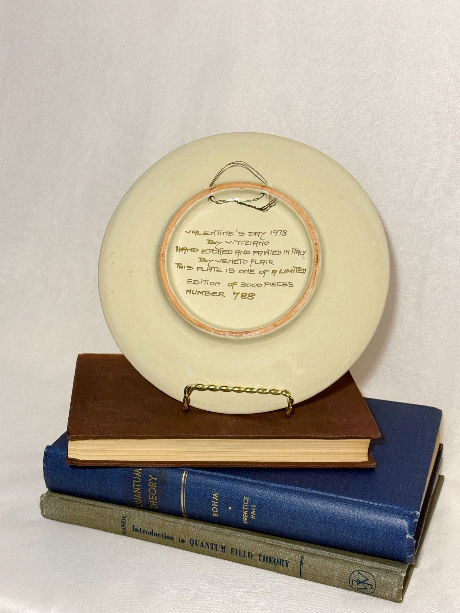 This plate is from the Valentines Day 1978 collection by renowned artist V. Tiziano. It's a collector's piece! Numbered 788 out of a limited series of 3000, this plate features meticulous hand etching and painting.