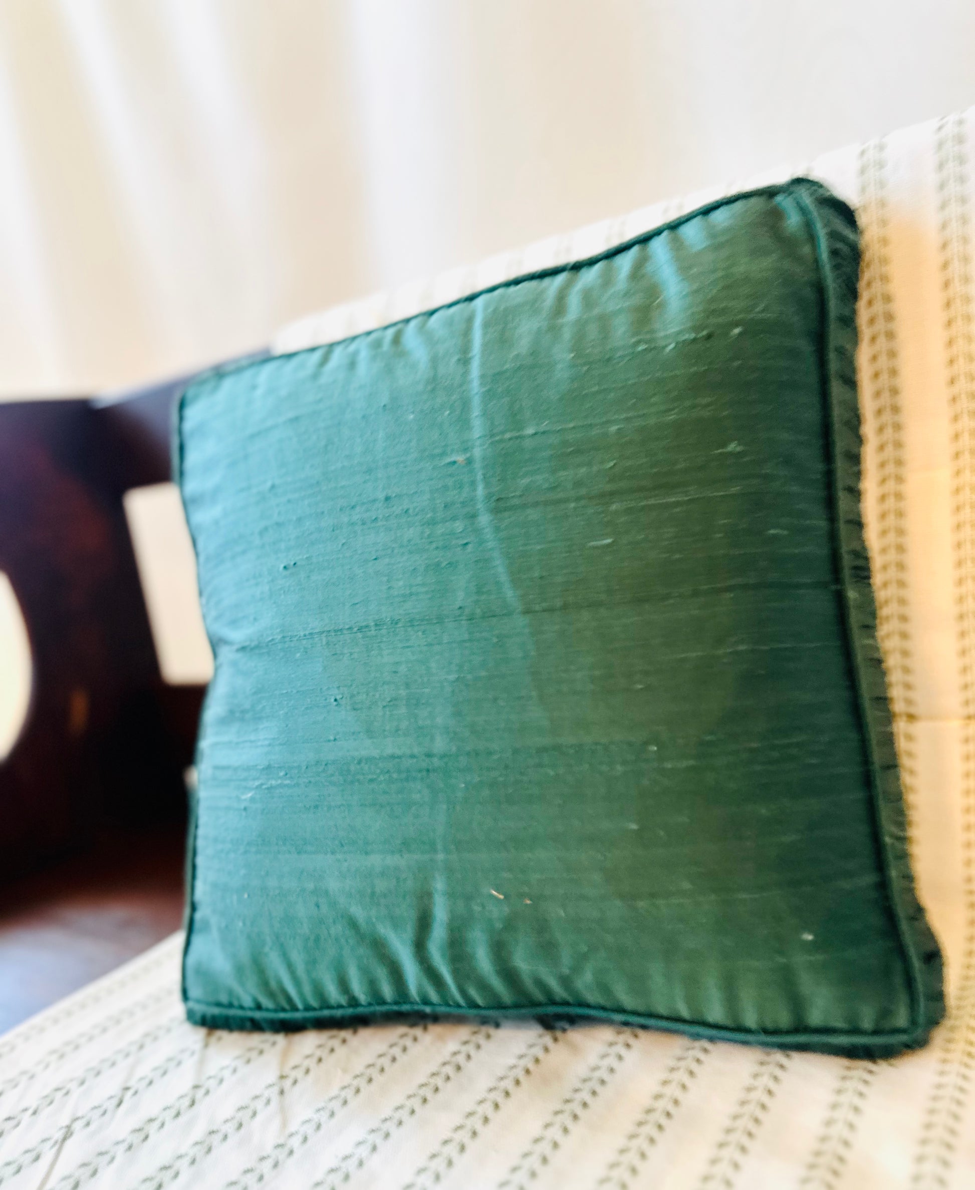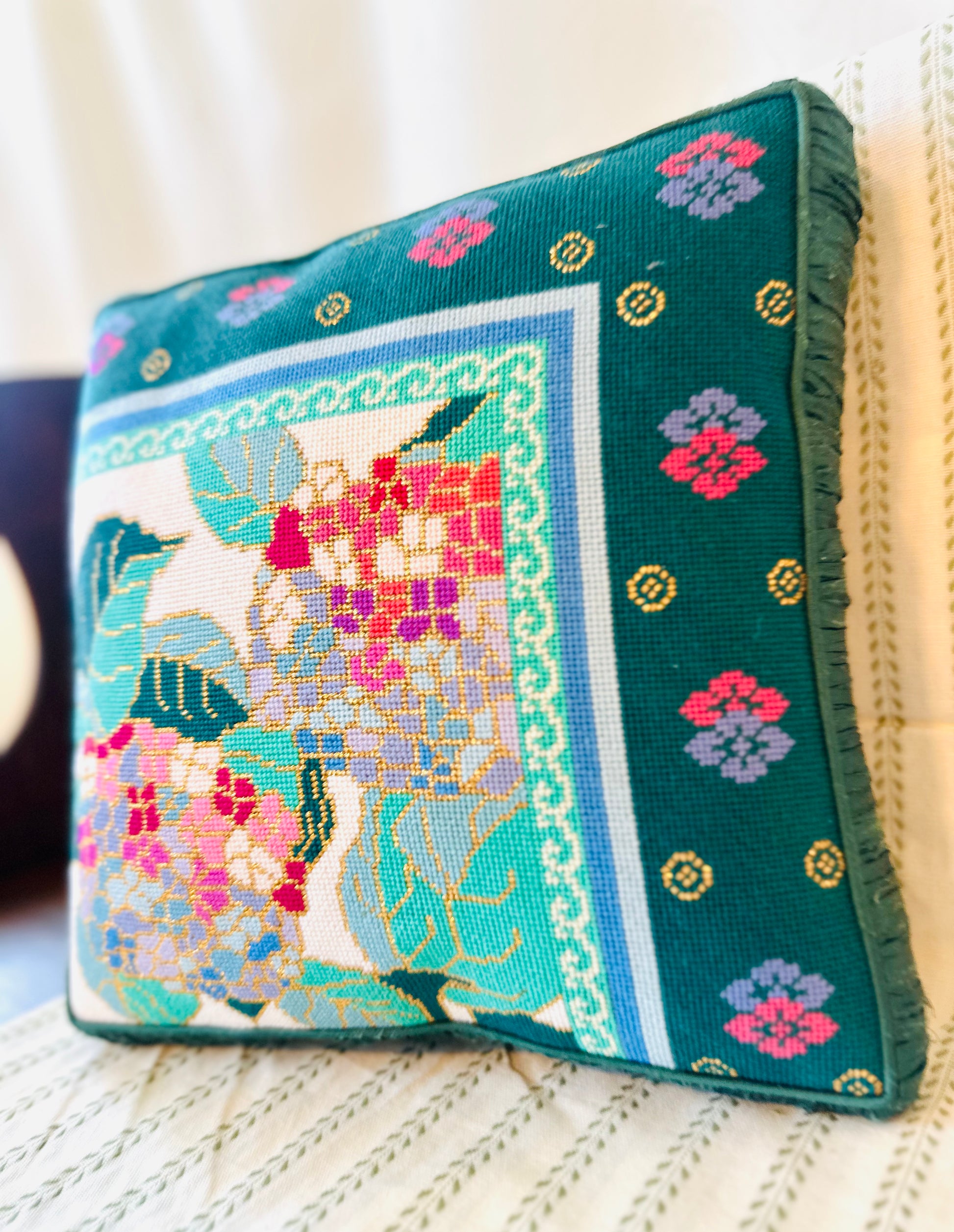 A decorative vintage needlepoint pillow with a floral design in rich jewel tones and a satin finish. Detailed, vibrant, and full of classic charm.